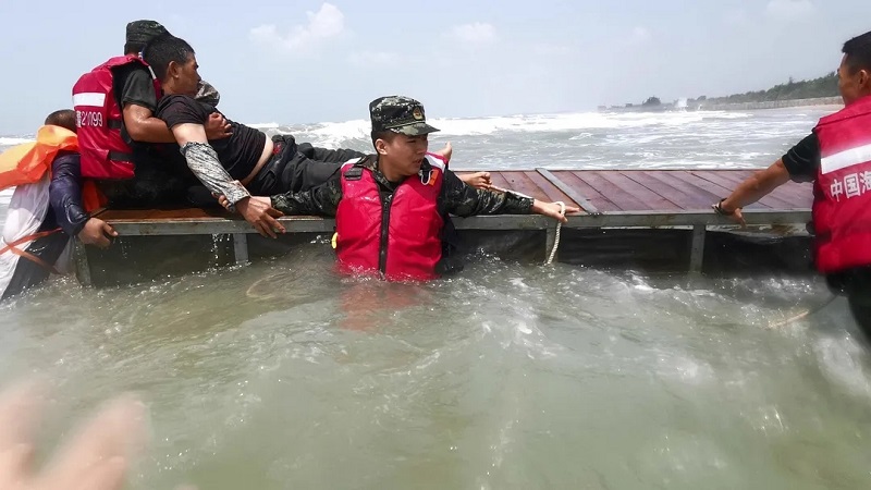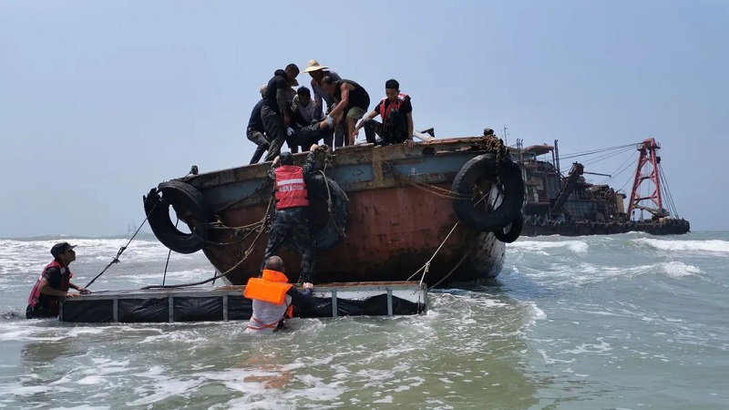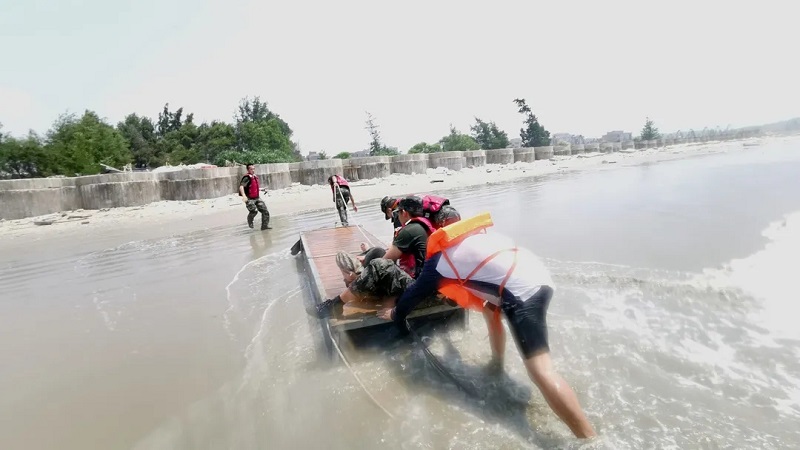 海警人员到达后,报警船舶已搁浅在靠近防浪堤外侧沙滩的海边。因现场海浪、暗涌较大,且水深较浅,海警执法艇几次尝试靠近报警船舶,均被涌浪推开,无法实施救援。救援行动一度陷入僵局。面对现场困难,海警人员分析现场海况,快速制定救援路线,从防浪堤外侧沙滩上下海,将伤员从船上通过泡沫浮板转移到防浪堤外侧沙滩,再通过海警执法艇将伤员转移至码头。