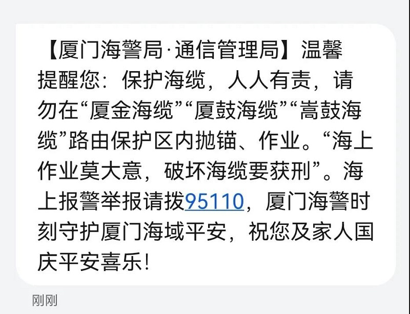 另讯: 福建厦门海警局 全力做好国庆期间海缆管护专项执法 海警执法员开展执法检查 为确保工作实效,厦门海警局联合厦门市通信管理局开展主题鲜明、形式多样、富有实效的专项宣传活动,于国庆节前夕发送温馨提醒短信668万条,切实提高群众守护海缆意识。 发送温馨提醒短信 据悉,厦门海警局结合“海盾2021”专项执法行动,于9月27日至10月12日开展为期15天的“深海卫士”海缆管护专项执法,确保国庆期间厦门海域海缆运行畅通安全。“前方船舶请注意,该海域为海缆保护区,请尽快驶离,不要在附近抛锚和生产作业”。
