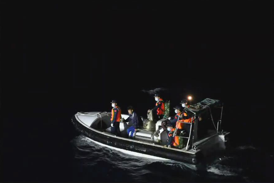 鉴于夜间海上能见度低、涌浪大、两船舷差高,直接转移伤员极易造成二次伤害。为确保救援成功,万山舰吊放2艘执法小艇,由该舰领导带队,随舰医生、卫生员等10人携带医疗器械驶靠渔船展开救援。