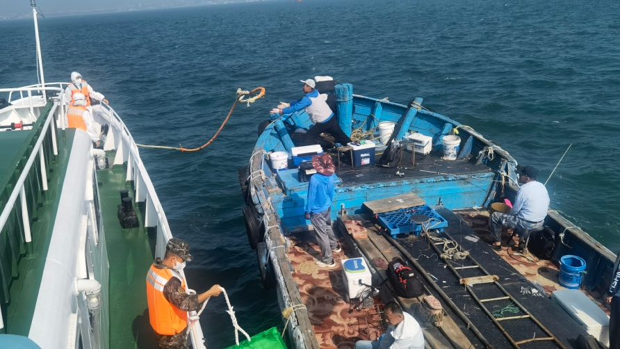 近日,山东青岛海警局在巡逻时成功救助一艘失去动力船舶,帮助12名渔民脱困。青岛海警局执法舰艇在日常巡航时,发现一渔船失去动力,船上人员神情焦急挥舞国旗向海警执法舰艇求救。