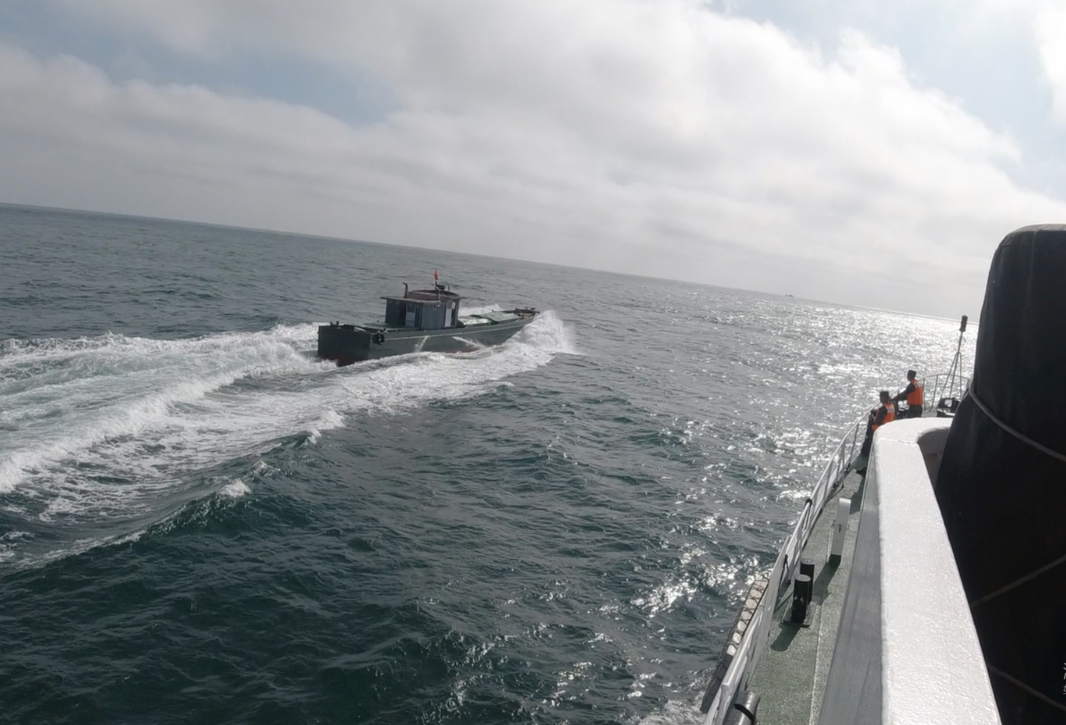 当日13时许,漳州海警局获悉在东山县兄弟屿附近海域存在货物走私活动的迹象,该局迅即派遣琅岐舰前往查缉。到达目标海域后,琅岐舰执法员展开海上搜索并迅速识别锁定一艘可疑船舶,该船舶未涂刷船名船号,甲板用绿色帆布遮掩货物,且发现海警执法船后加速转向逃窜。
