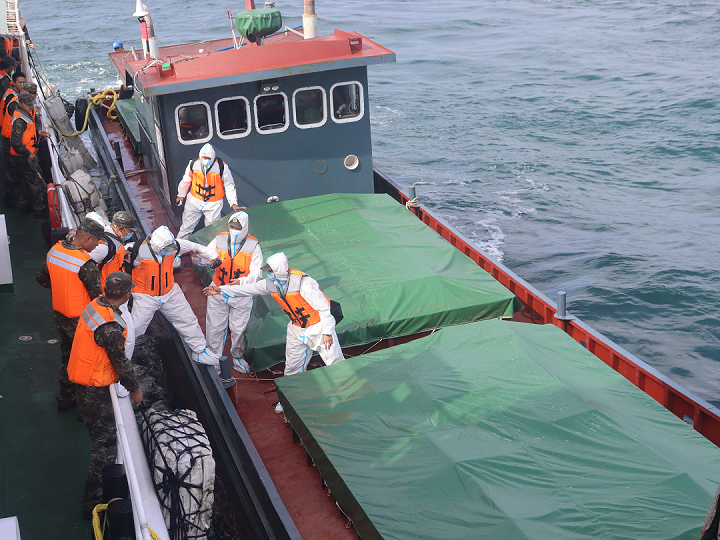 琅岐舰立即向可疑船舶逼近,同时亮明执法身份、喊话示警拦截,并强行靠帮登临检查。经查,该船装载荷花、芙蓉王等品牌香烟1200余件共60000余条,船上人员无法提供香烟相关合法手续,涉嫌走私。海警执法员依法扣押该船,并对涉案货物进行核酸检测采样及消杀。目前,该案件正在进一步侦办中。